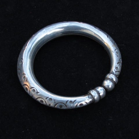 Højkvalitets sølvarmbånd fra vestlige eller centrale Timor, Indonesien. Mænd og kvinder bar denne type armbånd dekoreret med spiraler. De berømte guldsmede fra Ndao og Roti leverede denne regions sølvsmykker, for hvilke smeltningen af hollandske rijksdaalders leverede råmaterialet.