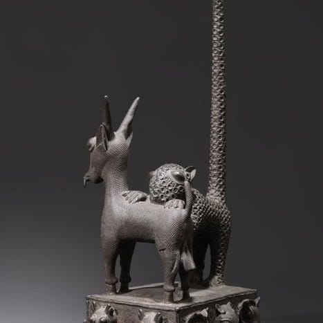 Bronzestykker af Ayutthaya-perioden (siden 17. århundrede/ begyndelsen af det 18. århundrede) med lak- og guldranden; uden sokkel 24 × 18 × 16 cm (med sokkel 34 × 18 × 16 cm); oprindelse Galerie/Antiquaire; fremragende stand; ægte/originial. Klik på den blå "gå til varen" knap, for at købe eller byde på denne vare. Den samlede pris vil blive vist inden du afgiver dit bud.