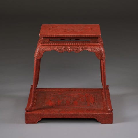 Forfinet antikt perlemorfladt bord / perlemor-udstillingsstativ, der er rige og smukke mønstre på bordpladen, benene og de fire sider, herunder gamle bygninger, mønstre af gamle mennesker, mønstre af kvinder der klæder sig i deres boudoir, samt mønstre af planter som grantræer og piletræer, livagtige og naturtro, der demonstrerer oldtidens suveræne lakteknik.