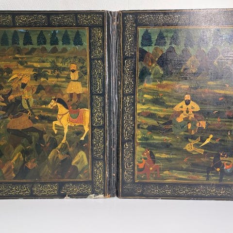 Vidunderlig miniature, der illustrerer en kampscene hentet fra Shahnameh (Kongeriget) af Ferdowsi, Irans nationale epos. Denne gouache på papir, udført på en tekstsiden skrevet i nastâ’liq-skrift og fordelt på 4 kolonner, skaber en dynamisk og frodig komposition typisk for atelierer i Centrale Asien. Man ser en kaotisk og farverig hærgen af ryttere og infanteri, bevæbnet med sabler, lancer og buer, i et virvarlandskab med OK- og blå og grønne nuancer. Figurene, med turbaner og farverige klæder (rød, gul, grøn, orange, purpur), flettes