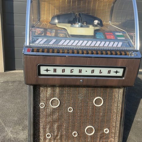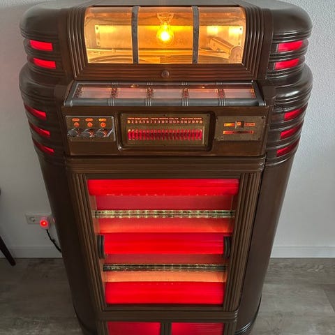 Wurlitzer model 1015 jukebox, produceret i USA i 1946, i fremragende fysisk stand og testet/virkende, cirka 145 kg tung, med 220 V strømforsyning, transformer 110–220 V og frekvensinverter 50–60 Hz, 24 valg af 78 rpm plader, og komplet møntrerie reviseret. Klik på den blå "gå til varen" knap, for at købe eller byde på denne vare. Den samlede pris vil blive vist inden du afgiver dit bud.