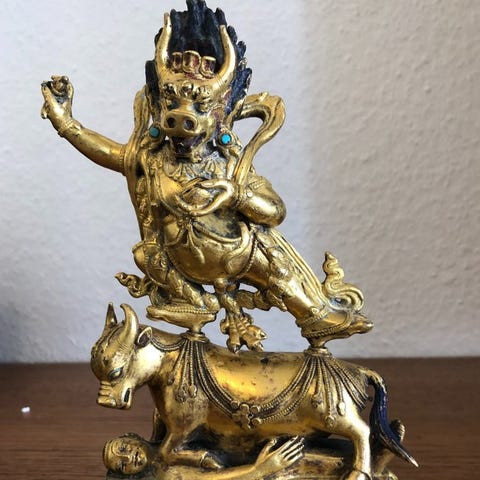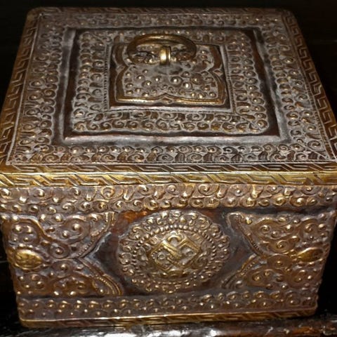 Antik tibetansk buddhistisk kobberritual Bhumpa-beholder med sølvbelægning og syv små sølvskeer, dateret til det 19.–20. århundrede, mål: 17 cm høj, 13 cm bred og 10 cm dyb, provenance Privatsammlung, autentisk/original i rimelig stand. Klik på den blå "gå til varen" knap, for at købe eller byde på denne vare. Den samlede pris vil blive vist inden du afgiver dit bud.