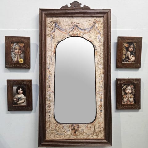 Spejl i træ, farve valnøddetræ med gulddekoration, med maleri af bjerglandskab, og 4 tryk af unge piger i trærammer; hver ramme måler 20x25 cm.