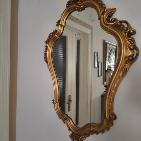 Væghængt spejl i træ i valnød med antikguld dekoration, med et bjerglandskabsmaleri og fire tryk af piger i trækfremkaldt i trærammer (hver 20x25 cm); oprindelse Italien, 1970–1980, som nyt stand, ydre mål 96 x 42 cm og indvendige mål 60 x 28 cm, består af 5 dele. Klik på den blå "gå til varen" knap, for at købe eller byde på denne vare. Den samlede pris vil blive vist inden du afgiver dit bud.