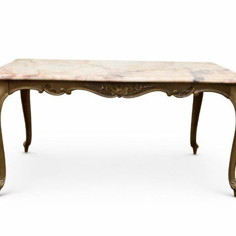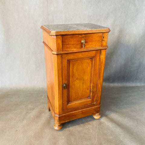 Overfladen er udført i naturlyse marmor, et materiale, der ofte anvendes i fine møbler i det forrige århundrede for dets holdbarhed og evne til at fremhæve træstrukturen