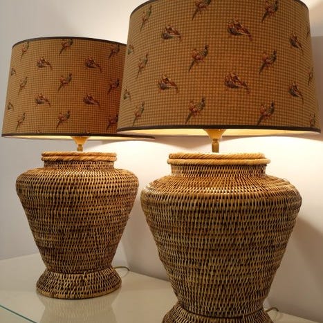 Et sæt på 27 brune rattanlamper fra Myanmar/Burma i moderne stil (1980–1990), 60 cm høje inklusive skærme, med nyt ledningsnet og skærme, i fremragende stand og fuldt funktionsdygtige, vægt 9 kg. Klik på den blå "gå til varen" knap, for at købe eller byde på denne vare. Den samlede pris vil blive vist inden du afgiver dit bud.