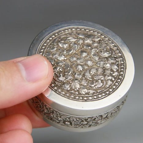 Tibetansk pendentiv-boks i massiv sølv, pyntet med turkis og koraller.
