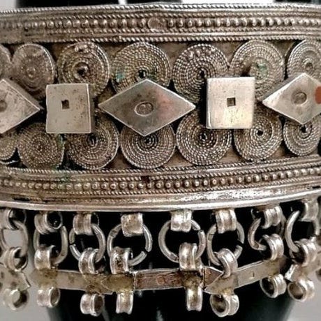 Den sjældne Musammat-armring, en sølv-armring fra Yemen (Tihama-regionen), vejer 351 g og har en indvendig diameter på ca. 7,5 cm og en ydre diameter på ca. 9,5 cm, vintage med synlige slidmærker. Klik på den blå "gå til varen" knap, for at købe eller byde på denne vare. Den samlede pris vil blive vist inden du afgiver dit bud.