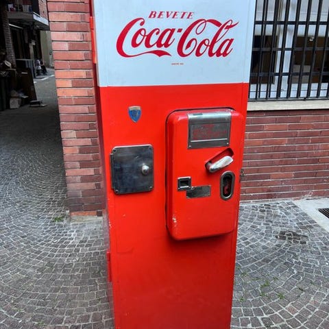 To stål Coca‑Cola vintage iskøleskabe fra Italien, dateret 1940’erne–1960’erne, i brugt tilstand med sandsynligvis manglende små dele, røde til farven, måler 60 cm i bredde, 60 cm i dybde og 100 cm i højde, og i funktion. Klik på den blå "gå til varen" knap, for at købe eller byde på denne vare. Den samlede pris vil blive vist inden du afgiver dit bud.