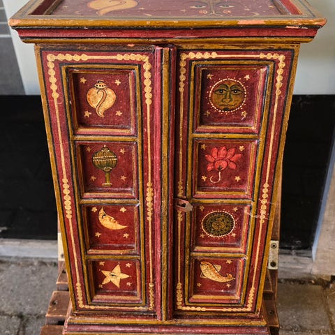 Dette imponerende skab blev traditionelt brugt i en tempel- eller helligdomsmiljø, sandsynligvis til opbevaring af rituelle genstande, ofringer eller hellige genstande.