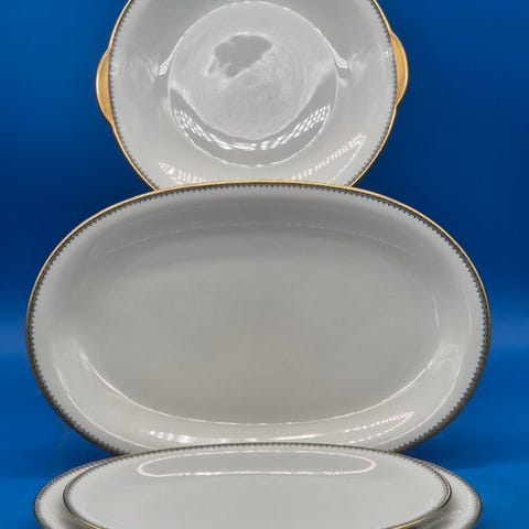 til salg står et elegant sæt bestående af to ovale serveringsbrætter fra den velrenommerede porcelænsfabrik Seltmann Weiden i Bayern.