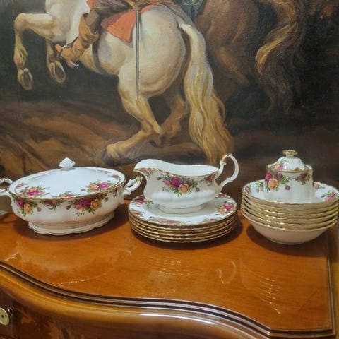 til salg står et omfattende kaffestel af fint Bone China fra den anerkendte engelske producent Royal Albert i dekoren „Moss Rose“. Kaffestellet imponerer gennem sin elegante formgivning, sarte rosemotiver og fine guldkanter og står for klassisk britisk porcelænskunst.
