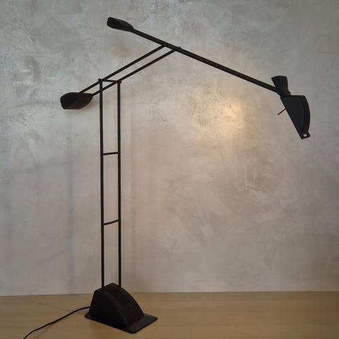 Industriel skæglampe i stål og plastik, oprindelsesland Italien, dateret til 1960–1970, udtrækkelig til 85 cm med E27-sokkel, 360° justerbar hoved og tænd/sluk-knap bag diffusoren, brugt tilstand med sandsynligvis små manglende dele; mål 84 cm bred, 30 cm høj, 18 cm dyb, vægt 2 kg, sort. Klik på den blå "gå til varen" knap, for at købe eller byde på denne vare. Den samlede pris vil blive vist inden du afgiver dit bud.