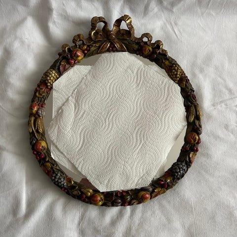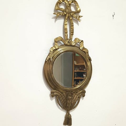 Teknik: træramme (lakeret), spejlglas med facetslebet, metal- eller plastapplikationer