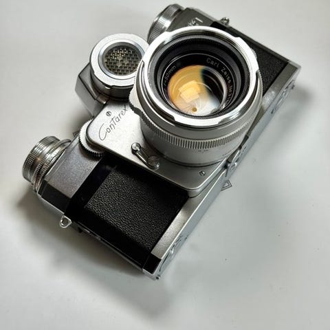 Lukningen udløses, og blænden fungerer. Frontlinsen på Tessar-objektivet er i god stand i forhold til alderen.