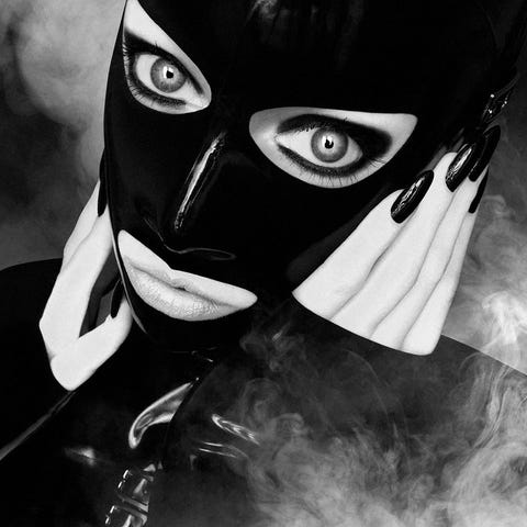 En frontal tilstedeværelse, magnetisk. Blikket gennemborer tavshedens stilhed, fastholdt af en maske, der skjuler lige så meget som den afslører. Kroppen står nøgen, taget på sig, men aldrig helt udstillet. Hele her spiller på spændingen: mellem skygge og lys, hudens blødhed og lædrets strenghed, sårbarhed og kontrol.