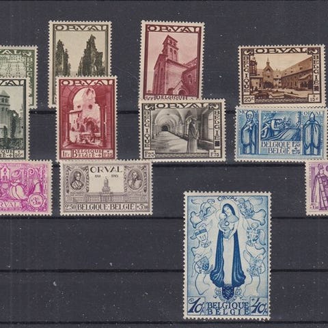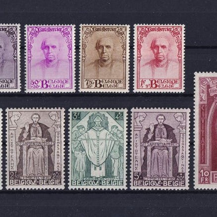 Belgiske frimærker med titlen '6 topwaarden uit de reeksen Kepi, Verpleegster, Dennen, Lotharingen en Ridder', OBP/COB 323/24, 332, 362, 383 og 400, udgivet mellem 1931 og 1934, i postfrisk stand. Klik på den blå "gå til varen" knap, for at købe eller byde på denne vare. Den samlede pris vil blive vist inden du afgiver dit bud.