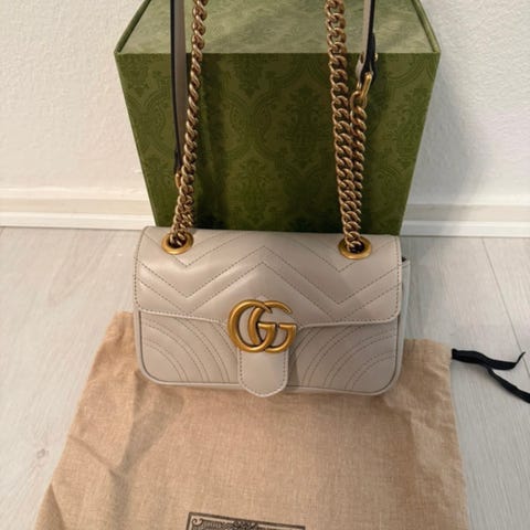 Gucci Marmont Flap i læder creme, mini størrelse (10 cm høj x 17 cm bred) med 1 genstand, inklusive ægthedskort, æske og støvpose; tilstand: Ny eller som ny, aldrig brugt, med eller uden original emballage. Klik på den blå "gå til varen" knap, for at købe eller byde på denne vare. Den samlede pris vil blive vist inden du afgiver dit bud.
