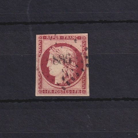 Fransk oprindelse, titel « signér Miro, 1er choix, superbe Bordeaux 5c vert jaune », oblitereret, fra 1870, Yvert n°42B, med ekspertunderskrift og uden certifikat. Klik på den blå "gå til varen" knap, for at købe eller byde på denne vare. Den samlede pris vil blive vist inden du afgiver dit bud.