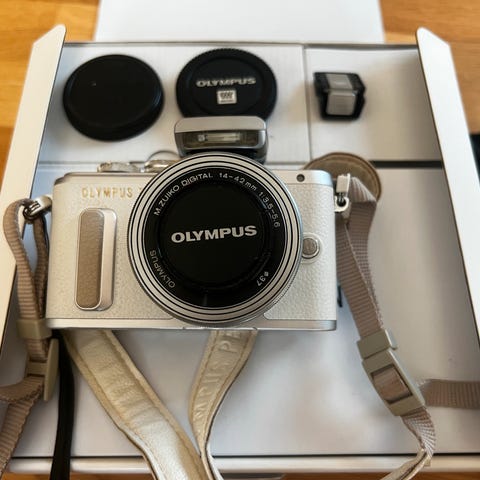Kit Olympus Pen Sort. Digitale Micro Four Thirds i fremragende stand med cirka 2200 eksponeringer. Leveres med ydre læderhus med greb som på billedet. Objektiverne i Pro-serien: 12-45 f/4 og 40-150 f/4 med linserne i orden og mekanikken i orden. Leveres med originale dæksler og paraluce. Lille blitz FL-LM3 med etui i fungerende stand og blitz FL-50R som på billedet i funktion. Originalemballagen følger med som på billedet. Kittet klar til brug.