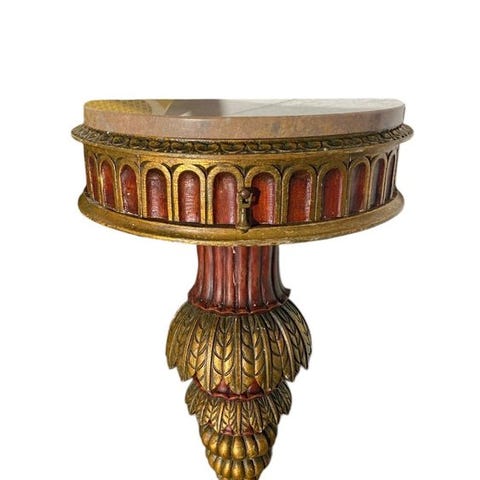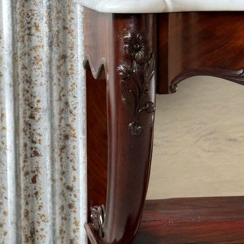 Antik Louis XVI-stil bronzekonsol med marmortopp, højde 67 cm, bredde 58 cm, dybde 28,5 cm, i pæn brugt stand med små tegn på ældning. Klik på den blå "gå til varen" knap, for at købe eller byde på denne vare. Den samlede pris vil blive vist inden du afgiver dit bud.