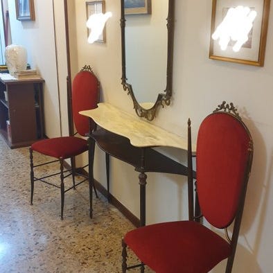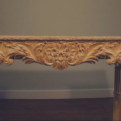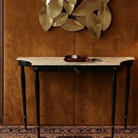 Et elegant og luksuriøst møbel. Marmortoppen i nuancer af hvid og grå.