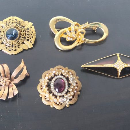Et flot sæt på 10 brosjer — vintage fra 1960-1980 — metal i gyldent og sølvagtigt meget skinnende — brosjer