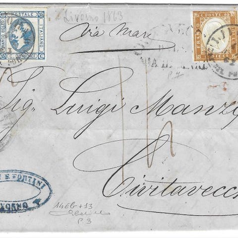 Kongeriget Italien, 1863, anvendt til post, Sassone T20, T21 og T26, med certifikat og ekspertunderskrift, tittel "Raccomandata da Napoli per Bradford (Inghilterra) RARITA'", et sjældent og smukt dokument om posthistorie. Klik på den blå "gå til varen" knap, for at købe eller byde på denne vare. Den samlede pris vil blive vist inden du afgiver dit bud.