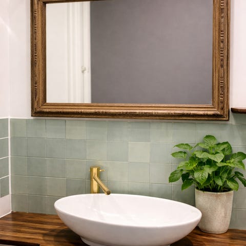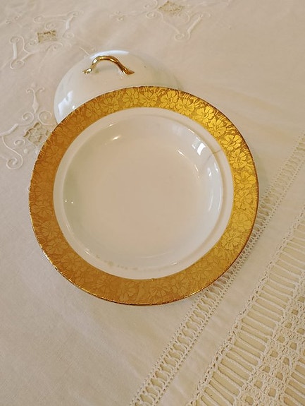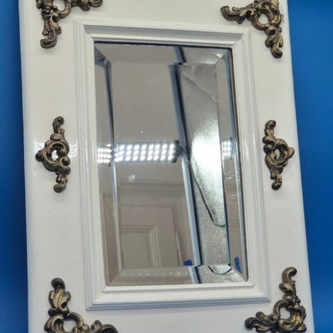 • Materiale: Rammen består af stuk eller en gipskomposit-blanding på en træbærer. Overfladen er håndmalet og delvist forædlet med en guldpatina (guldkant-udseende), hvilket giver spejlet et antikt