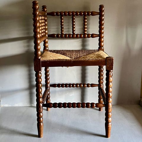 Sædet og rygstøtten er polstret med et senere påført stof med et traditionelt blomsterdekor, afsluttet med dekorative