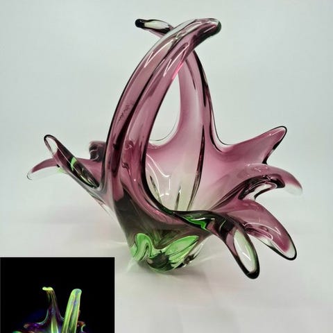 Håndlavet glaskurv af Egermann, oprindelse Tjekkiet, cirka 1990–2000, højde 36 cm, bredde 15 cm, dybde 3 cm, vægt 4 g, i næsten som ny stand. Klik på den blå "gå til varen" knap, for at købe eller byde på denne vare. Den samlede pris vil blive vist inden du afgiver dit bud.