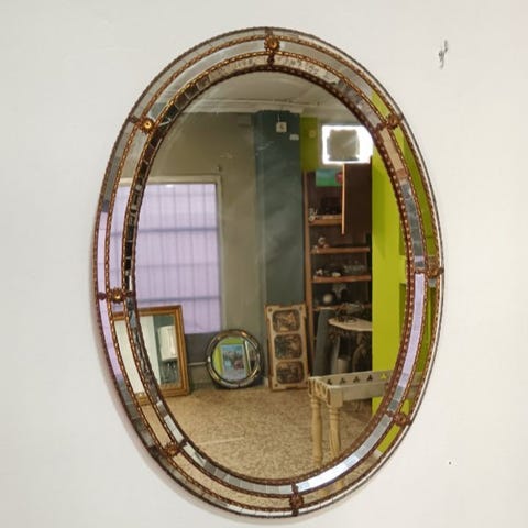 Sæt af runde konvekse spejle med gyldne rammer, ofte kaldet 'heksespejle' på grund af deres buede overflade, der forvrider spejlet. Disse boligindretningsgenstande er lavet med rammer i bladguldstræ fra 1950’erne til 1970’erne. Mål: diameter 44 cm / 21 cm / 18 cm / 15 cm / 14 cm. 5 spejle