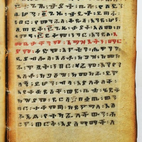 Manuskript på pergament - fra etiopisk område, på ge’ez-sprog - daterbart mellem det 18. og 19. århundrede: en af verdens ældste kristne traditioner, den etiopiske ortodokse kirke, dybt forankret siden det 4. århundrede og stærkt sammenflettet med forældede afrikanske religiøse overbevisninger. Den etiopiske religion udmærker sig ved enestående kontinuitet mellem bibelske elementer, helgenkult, apotropaisk brug af tekster og åndelig beskyttelsespraksis af atavisk oprindelse. Manuskriptet, med sin skrift skiftevis i rød og