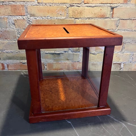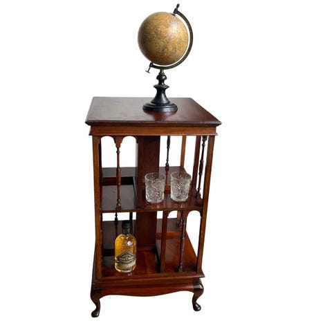 Drejeskøretøj af træ til bøger, fremstillet i Storbritannien cirka 1990–2000, træsorter mahogni, bøg og krydsfiner, højde 81 cm, bredde 47 cm, dybde 47 cm, vægt 8 kg, i god brugt stand med mindre aldersrelaterede tegn. Klik på den blå "gå til varen" knap, for at købe eller byde på denne vare. Den samlede pris vil blive vist inden du afgiver dit bud.