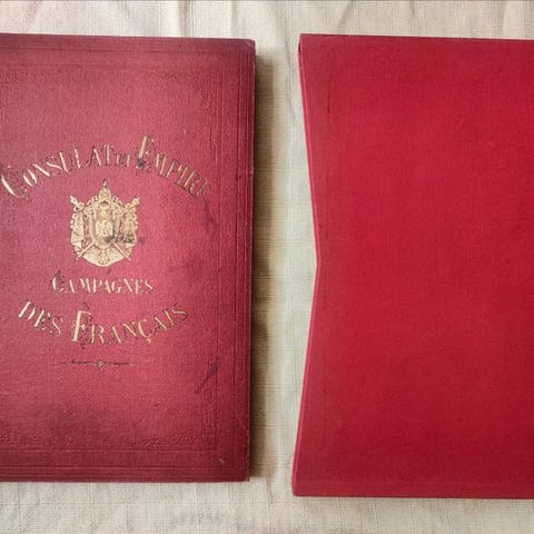 Indbundet af forlaget i halvskind og rød percaline, ryg glat prydet med gyldne kartuscher dekoreret med gyldne kejserbier, forsider rigt illustrerede med napoleonske symboler i gyldent, guards og indersider af fineret papir, alle kanter gyldne.