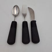 Hvert bestik består af en metaldel og en grå plastikdel.
