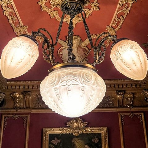 En enkelt hængelampe i Haussmann-stil af krystal og glas, fra Frankrig, gyldenguldfarvet, 150 cm høj og ca. 110 cm bred, i god brugt stand med små aldersrelaterede spor, i funktion. Klik på den blå "gå til varen" knap, for at købe eller byde på denne vare. Den samlede pris vil blive vist inden du afgiver dit bud.