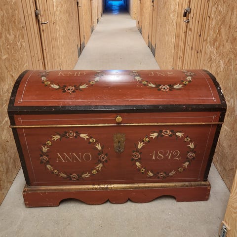Rejsekiste fra slutningen af 1800-tallet til begyndelsen af 1900-tallet. Fremstillet af træ, dækket med lærred. Låse og beslag i messing; der findes ingen nøgler til låsen. Håndtag og kanter i læder. Indvendigt er der spænder til at holde tøjet på plads og et rum, der åbner sig som et foldepanel i træ og stof. På begge sider sidder små messingplader, der angiver producenten: G. Winternitsz Valigeria Universale Genova. Genstanden viser tegn på tidens gang, men den er dog fuldstændig velbevaret uden skader eller manglende dele. Den