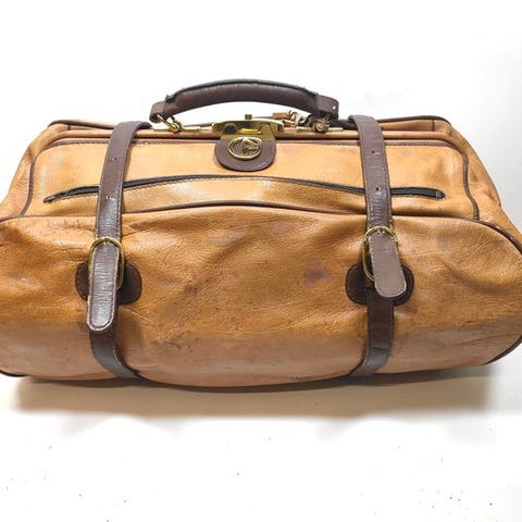 Brun læder og stof rejseskrin af Valigeria Universale Genova, tilskrevet designer G. Winternitsz, dateret 1850–1900, med messingslåse, læderhåndtag og kanter, inderrum af træ og stof med fagereol i accordion, ingen nøgler, dimensioner 91 × 55,5 × 50 cm, Italien ( Ligurien ), i god brugt stand med aldersmærker. Klik på den blå "gå til varen" knap, for at købe eller byde på denne vare. Den samlede pris vil blive vist inden du afgiver dit bud.