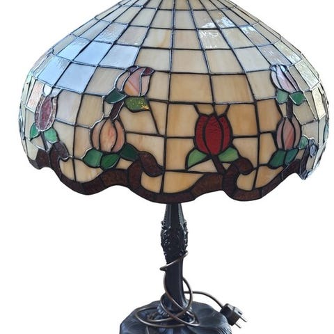 Antik neoklassisk stil bordlampe med cremefarvet opalinsk glasskærm og bronzefarvet metalfod, 30 cm dybde, 30 cm bredde og 40 cm højde, dateret til 1950–1960, i god brugt stand og i funktion. Klik på den blå "gå til varen" knap, for at købe eller byde på denne vare. Den samlede pris vil blive vist inden du afgiver dit bud.