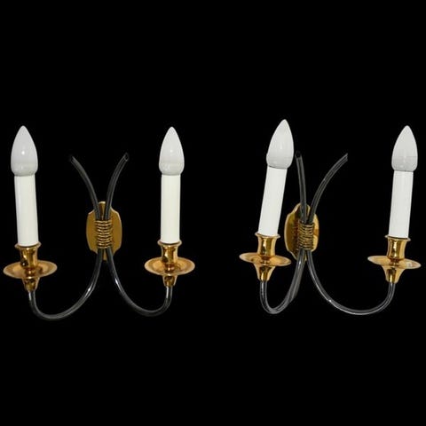 Et to-lysst væglampe fra Italien i florentinsk håndsmedet forgyldt jern med krystaldråber, fra 1960–1970, vintage Hollywood Regency-stil, i fremragende stand og fuldt funktionel. Klik på den blå "gå til varen" knap, for at købe eller byde på denne vare. Den samlede pris vil blive vist inden du afgiver dit bud.
