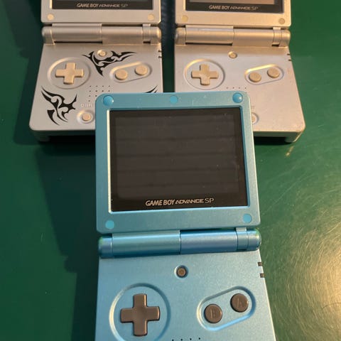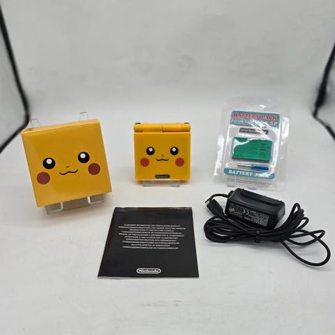 Set med to Nintendo Game Boy Advance SP-konsoller med original oplader, to GBA trådløse adapters, et linkkabel og et udvalg af spil inklusive Pokémon og NES Classics; konsollerne testet og i god stand og fungerer. Klik på den blå "gå til varen" knap, for at købe eller byde på denne vare. Den samlede pris vil blive vist inden du afgiver dit bud.
