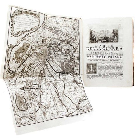 Publiceret i Paris i 1736, Ecole de Cavalerie af François Robichon de La Guérinière repræsenterer det teoretiske og praktiske topunkt af europæisk klassisk ridning. En grundlæggende værk for den franske høje skole, traktaten systematiserer viden om hesten, dens uddannelse og dens bevarelse i henhold til en balance mellem nådighed, disciplin og oplyst rationalitet. Dette to-binds exemplar, med kobberstikkede tegninger af høj kvalitet, udgør en af de mest eftertragtede udgaver af teksten, der havde en dybtgående indflydelse på ridekunsten helt op til Wien-skolen og den moderne akademiske