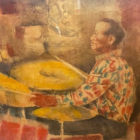 Dette maleri fra 2008, udført i blandet teknik, viser Lita Cabelluts karakteristiske tilgang til det menneskelige portræt. Ansigtet synes delvis at træde frem og delvis at forsvinde i kraftige lag af maling, skrabespor og kontrasterende farvefelter. Mørke toner afbrydes af røde og lyse accenter, hvilket skaber et intenst spændingsfelt mellem sårbarhed og styrke.