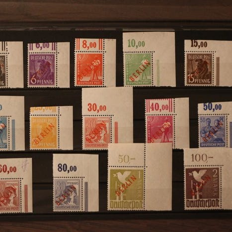 Berlin 1949 - Rød optryk: 7 værdier med OR, hvor den gode 1 Mark - godkendt S...
