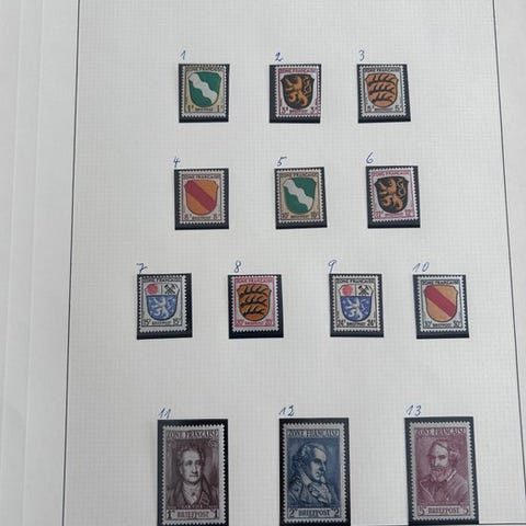 Tyskland 1945-1949, samling af fællesudgaver, den Franske Zone og Bizone. Næsten alt postfrisk (alle vigtige udgaver!). Dermed mange ekstraer, kantstykker, enheder osv. I Lindner Falzlos-albummet. Også gennemførte Posthorn-optryk.!! Blokkene fra den franske zone osv. Direkte fra samleres efterladenskaber. Enorm katalogværdi.