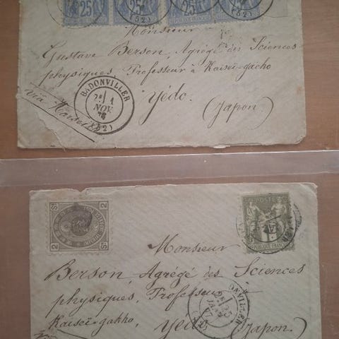 Fire komplette kuverter (fold) sendt fra Frankrig til Japan mellem april og september 1879. Disse forsendelser er adresseret til Monsieur Gustave BERSON, agrégé i Fysiske Videnskaber, som på det tidspunkt var på videnskabelig mission ved Den kejserlige Universitet i Tokyo (Yedo).