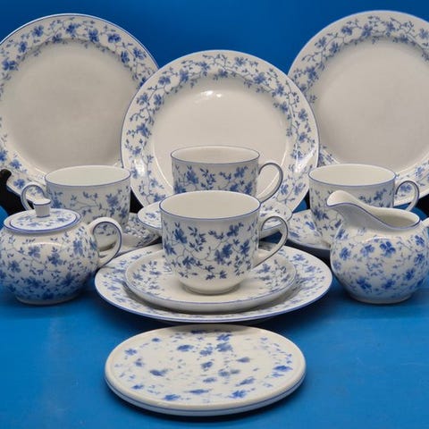 til salg står et omfattende og elegant kaffe- samt te-service af fin porcelæn fra den traditionsrige manufaktur Eschenbach Bavaria. Sættet fremhæver sin tidløse, buede formgivning og et elegant design med en fin gylden kant, suppleret af et delikat, blå geometrisk bånddekor.