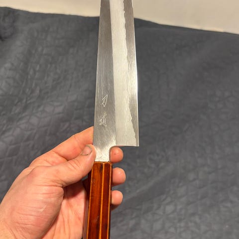 Introducerer Ketsueki, et mesterligt køkken-katana fremstillet af K Romain i samarbejde med japanske håndværkere. Dette fantastiske kniv kombinerer elegancen af traditionelt japansk design med enestående funktionalitet. Forget af højkarbonstål, bladet er barberbladskarpt og holdbart, perfekt til skiver, hakning og præcisionssnit. Det håndsmedede hamon og indviklede udskæringer afspejler japansk håndværkskunst. Det ergonomiske håndtag, fremstillet af bæredygtigt træ, giver et behageligt greb og balance. En ægte samlergenstand for kulinariske entusiaster, Ketsueki er både et kunstværk og et kraftfuldt køkkenredskab. Begrænset oplag.