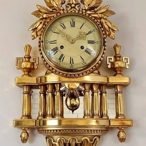 18. århundredes frisisk stolclock fra Nederlandene (ca. 1750–1800) i en udskåret trækasse med forgyldte messing‑søhesteornamenter, vægt-drevet fangekehusebevægelse med verge ’s escapement, 12 timers bevægelse med 1 dages varighed, slår hele timen og halve time, dimensioner 75 × 36 × 28 cm, vægt ca. 20 kg, god stand med tegn på ældning og i gangværende orden. Klik på den blå "gå til varen" knap, for at købe eller byde på denne vare. Den samlede pris vil blive vist inden du afgiver dit bud.